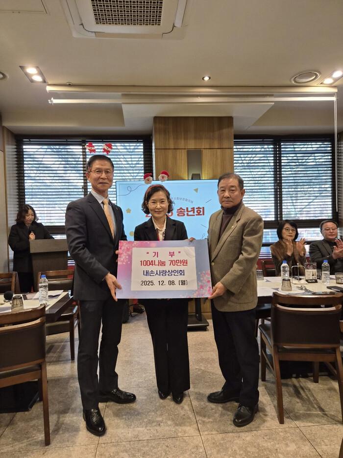 | ▲ 의왕시 내손2동 내손사랑상인회가 최근 연말을 맞아 지역사회 어려운 이웃을 돕기 위해 내손2동주민센터에 1004나눔 기부금 70만원을 전달했다 /사진제공=의왕시 |