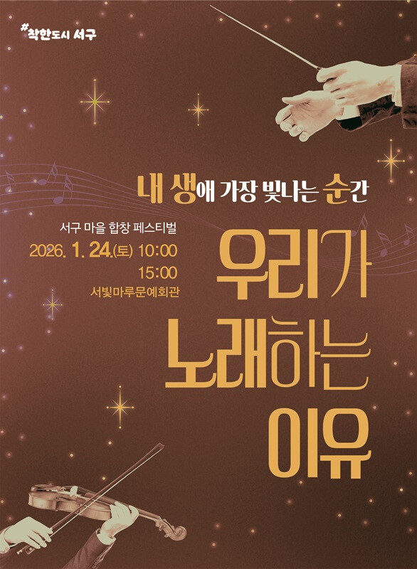 김이강 서구청장은 “주민 각자의 목소리가 어우러지며 마을이 하나 되는 힘을 만들어내고 있다”며 “앞으로도 마을마다 음악과 선율이 흐르는 풍요로운 생활문화가 자리 잡을 수 있도록 마을합창단 활동을 지속적으로 지원하겠다”고 말했다.