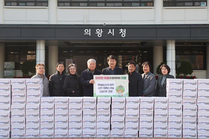 | ▲ 한국공인중개사협회 라면 박스 기부한 뒤 관계자들이 기념 촬영을 하고 있다 /사진제공=의왕시 |