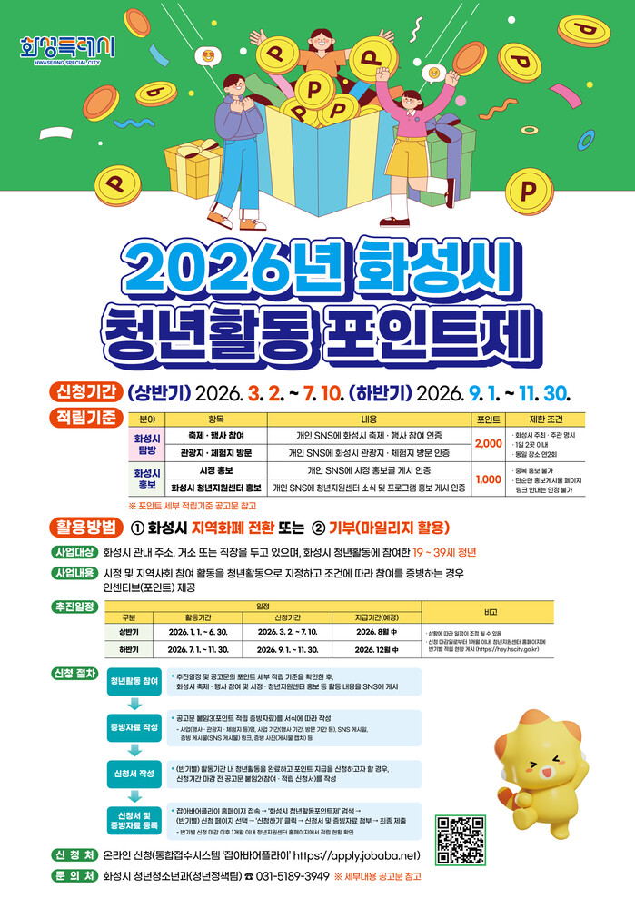 참여 대상은 만 19세부터 39세까지의 청년으로, 화성시 축제·행사 참여, 관광지 탐방, 시정 홍보 활동 등에 참여한 후 증빙자료를 제출하면 연간 최대 15만 포인트를 받을 수 있다. 지급된 포인트는 화성시 지역화폐로 전환하거나 기부할 수 있다.