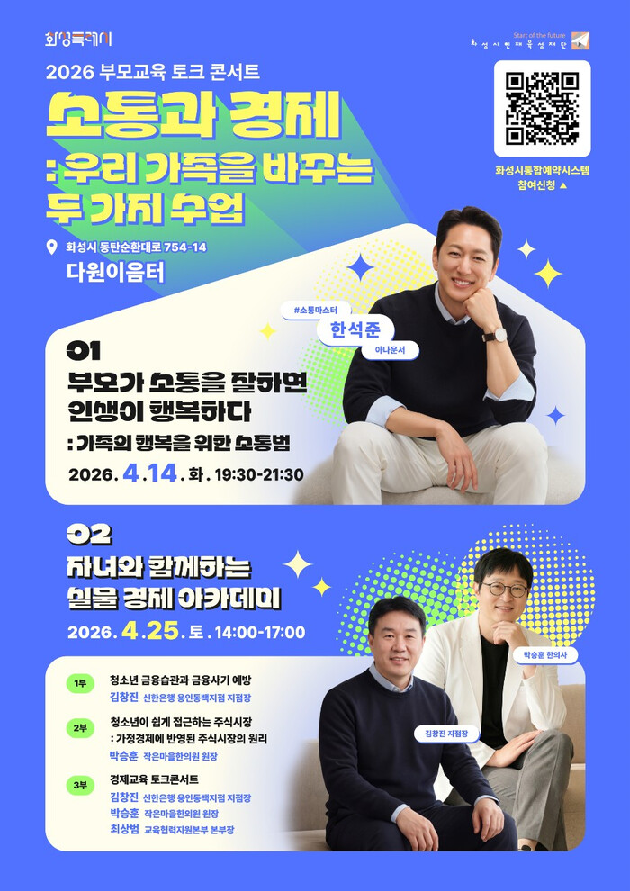 [화성=송윤근 기자] 경기 화성시인재육성재단(대표이사 임선일)은 2026년 부모교육 사업의 일환으로, 학부모와 자녀가 함께 참여하는 「소통과 경제: 우리 가족을 바꾸는 두 가지 수업」 토크콘서트를 운영한다. 토크콘서트는 가족 간 건강한 관계 형성을 위한 소통 교육과 자녀의 올바른 경제관 형성을 위한 경제교육을 주제로 구성되어, 대상별 맞춤형 프로그램으로 운영된다.