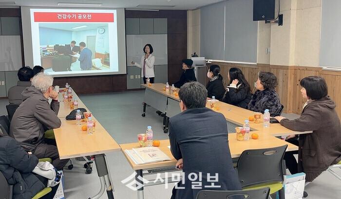 | ▲ 강진군 보건소 직원이 지난 24일 건강걷기사업 추진 경과 등을 설명하고 있다. / 강진군 제공 |
