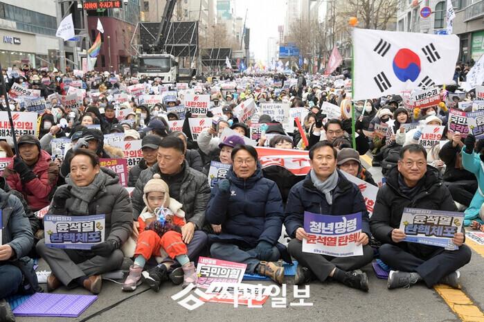| ▲ 강기정 광주광역시장(사진 가운데)이 지난해 12월 14일 오후 금남로 일원에서 열린 광주시민 총궐기대회에 참석해 시민들과 함께 구호를 외치고 있다./광주광역시 제공 |