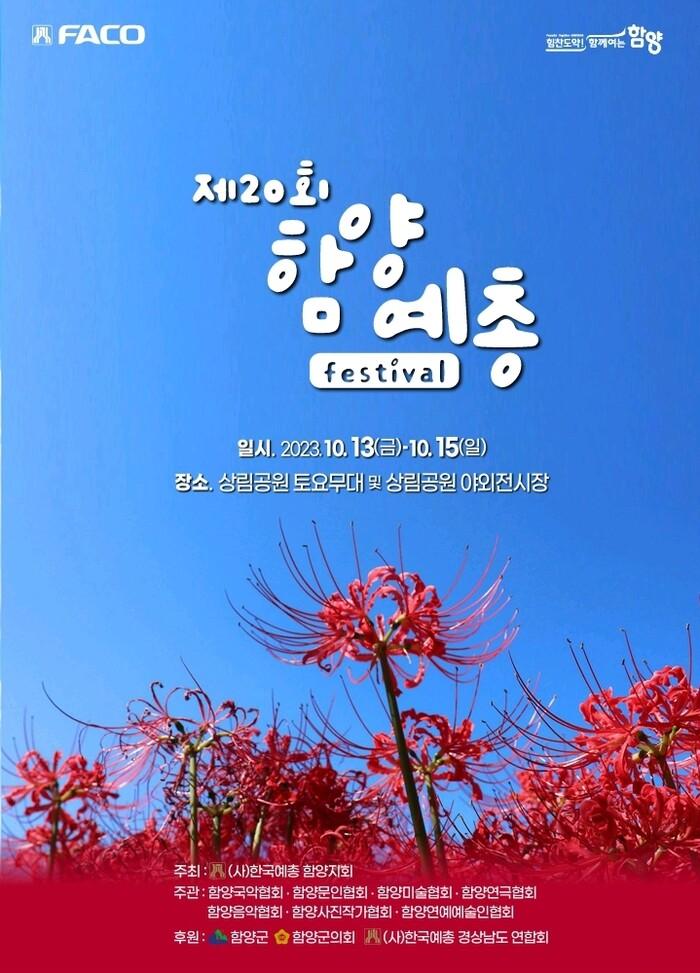 제20회 함양예총제는 13일 도민예술단-선유풍물연구소 국악공연을 시작으로, 함양예술단체 동아리 경연대회가 진행될 예정이며, 오후 7시에 개막식에 이어 함양음악협회, 함양남성합창단, 함양국악협회, 함양연예예술인협회의 축하공연이 열린다.