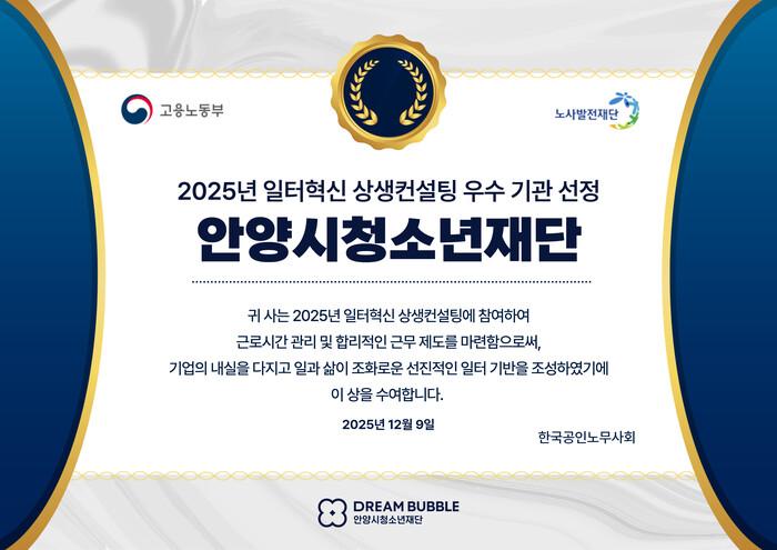 | ▲ 안양시청소년재단은 고용노동부가 주관한 2025년 일터혁신 상생컨설팅에 참여해 근로시간 관리 체계 개선과 합리적 근무제도 마련을 통해 우수 기관으로 선정됐다 /사진제공=안양시 |