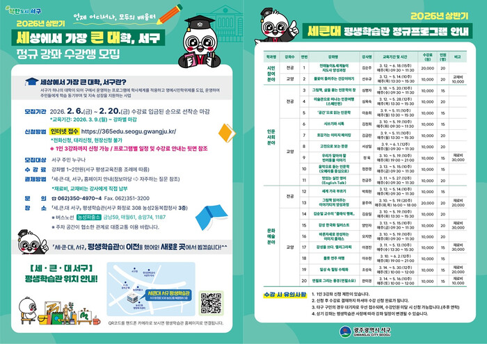 박현숙 행복교육과장은 “서구민 모두가 언제 어디서나 배우는 기쁨을 누릴 수 있도록 내 곁에 평생학습을 실현하고자 다양한 강좌를 준비했다”며 “세큰대 정규강좌를 통해 주민들이 배움을 통해 삶의 만족과 행복을 높이는 계기가 되길 바란다”고 말했다.