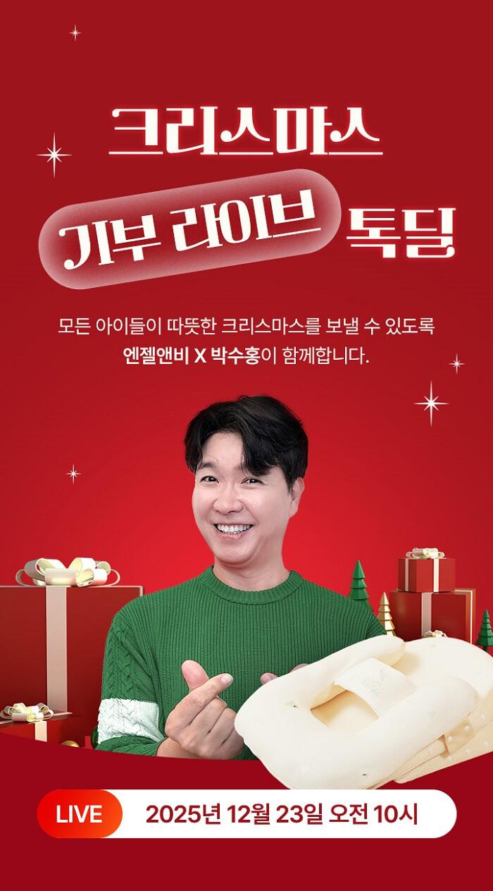 이번 기획전을 통해 모인 기부금은 박수홍의 출연료 전액, 엔젤앤비의 라이브 방송 판매 수익금 전액, 카카오같이가치 캠페인을 통한 기부금을 합산하여 박수홍이 24년간 후원해온 ‘애신보육원’에 전달될 예정이다. 이번 라이브는 단순 제품 판매를 넘어 이용자들이 기부 과정에 직접 참여할 수 있도록 구성된 것이 특징이다.