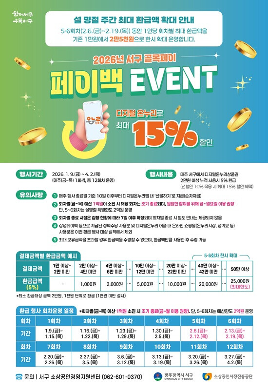 김이강 서구청장은 “명절을 앞두고 소상공인과 주민 모두에게 실질적인 도움이 되도록 페이백 혜택을 대폭 확대했다”며 “골목상권에는 힘이 되고 주민들에게는 풍성한 설 선물이 되는 ‘착한 경제도시 서구’를 만들기 위해 최선을 다하겠다”고 말했다.