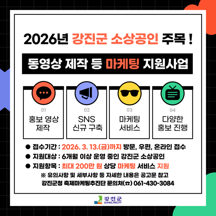 지원 대상은 강진군에 사업자등록과 사업장 주소를 두고 공고일 기준 6개월 이상 영업 중인 소상공인이다. 선정 시 최대 200만원 상당 마케팅 서비스를 지원하며 지원 항목은 홍보 영상 제작, SNS 신규 구축, 기타 마케팅에 필요한 서비스이다.