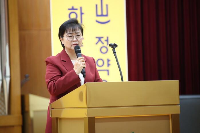 | ▲지난 7일 서울사이버대학교 평생학습교육관에서 열린 '제24기 생활속 다산사상 아카데미 개강식'에 참석한 이순희 구청장이 수강생들에게 인사말을 전하고 있다. (사진=강북구청 제공) |