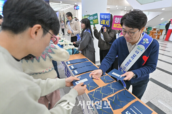 | ▲ 광주 서구청 관계자가 10일 설 명절을 앞두고 서구청 1층 로비에서 출근길 직원 등을 대상으로 부정청탁 및 금품(선물) 수수 등 부패행위 근절을 위해 청렴 실천 안내문이 담긴 청렴봉투를 나눠주며 청렴 캠페인을 실시하고 있다. / 광주광역시 서구 제공 |