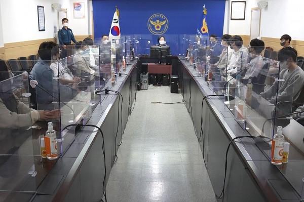 | ▲ 서울문화예술대 항공보안학과 학생들과 안양만안경찰서장(진점옥)과의 환담 모습 |