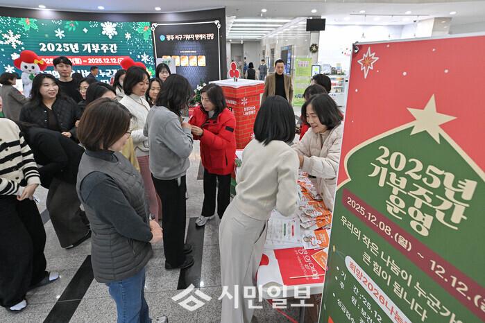 [광주=정찬남 기자] 광주광역시 서구는 8일 법정 기부 주간(12.8~12.12)을 맞아 서구청 1층 로비 및 광장에서 광주사회복지공동모금회(회장 구제길)와 함께 '사랑의 열매 배지 달기', '희망2026나눔캠페인 안내' 등을 진행하며 직원과 주민을 대상으로 기부 문화 활성화 캠페인을 실시했다. / 광주광역시, 서구청 제공