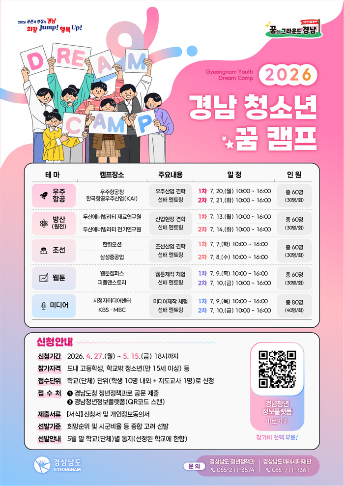 [창원=김점영 기자] 경남도는 도내 고등학생과 만 15세 이상 학교밖청소년을 대상으로 27일부터 5월15일까지 2026년 경남 청소년 꿈 캠프 참가자를 모집한다고 밝혔다.