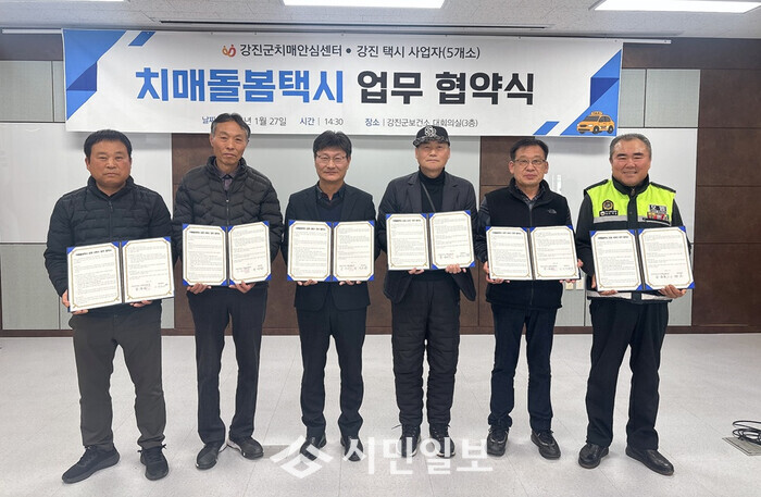 | ▲ 강진군보건소, 지난 27일 치매환자와 이동이 불편한 주민들의 편의를 높이기 위해 관내 개인택시사업자 5명과‘치매돌봄택시’ 송영서비스 업무협약 체결 자료사진 / 강진군 제공 |