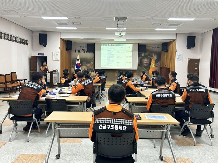 이번 훈련은 경상남도안전체험관에서 대형화재로 인한 다수사상자 발생으로 각 상황메세지 부여에 따른 각 부·반별 토의·발표방식으로 실시됐다.