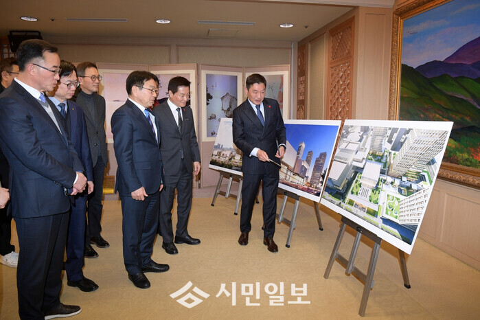 | ▲ 강기정 광주광역시장(앞줄 왼 쪽부터 세 번째)이 5일 오전 시청 비즈니스룸에서 박주형 ㈜신세계 대표이사와 광천터미널 복합화사업 투자양해각서를 체결한 후 이동훈 광주신세계 대표로부터 조감도에 대한 설명을 듣고 있다. /광주광역시 제공 |