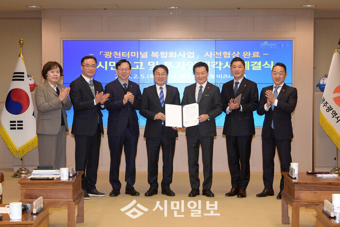 광주광역시(시장 강기정)는 ㈜신세계와 5일 시청 비즈니스룸에서 ‘광천터미널 복합화사업 도시계획변경 사전협상 결과 대시민 보고회 및 투자 양해각서 체결식’을 개최했다.