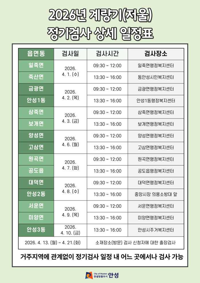 정기검사는 4월 1일부터 10일까지 읍·면·동 순회검사 방식으로 진행되며 검사 장소는 각 행정복지센터를 비롯해 안성시 주거복지센터와 안성중앙시장 등이다.