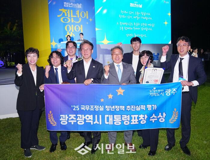 | ▲ 강기정 광주광역시장(왼 쪽부터 다섯 번째)이 지난 9월20일 청와대 녹지원에서 열린 ‘청년의 날 기념식’에 참석해 김민석 국무총리로부터 '청년정책 우수기관' 대통령 표창을 수여받은 뒤 기념촬영을 하고 있다. /광주광역시 제공 |