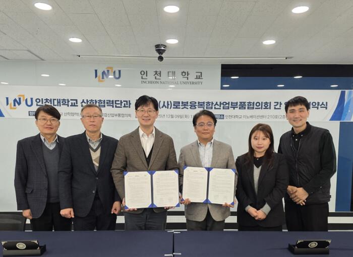 | 인천대 산학협력단과 로봇융복합산업부품협의회간 업무협약 체결행사 참가자들이 포즈를 취하고 있다. (사진=인천대) |