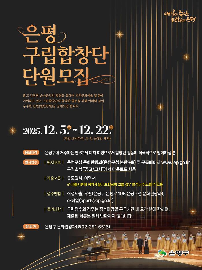 김미경 은평구청장은 “은평구립합창단은 합창 예술을 통해 지역 문화 발전에 큰 역할을 하고 있다”며 “이번 신규 단원 모집에도 많은 관심과 참여를 부탁드린다”고 말했다.