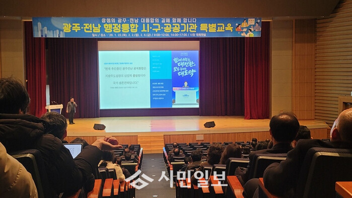 광주광역시 인재교육원은 22일부터 다음 달 2월6일까지 총 6차례에 걸쳐 시와 5개 자치구, 공공기관 소속 공직자 4000여 명을 대상으로 ‘광주전남 통합 특별교육’을 실시한다.