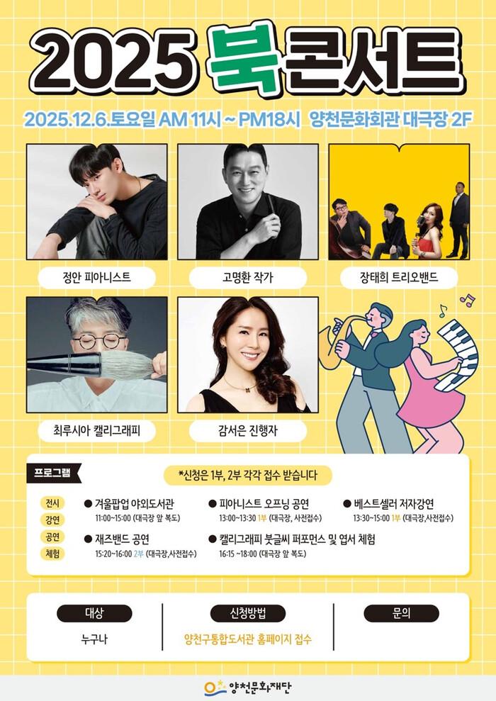 이번 북콘서트는 오전 11시부터 오후 6시까지 양천문화회관 대극장과 로비에서 강연·공연·체험·전시 등 다양한 프로그램으로 진행되며, 책과 예술을 함께 즐길 수 있는 자리로 마련된다.