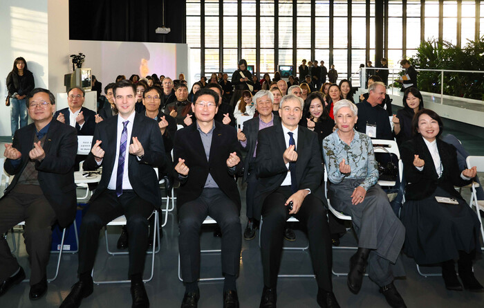 | ▲ 용인특례시 백남준아트센터에서 열린 자그레브 현대미술관과의 공동기획전 '불연속의 접점들' 개막식 참석자들이 기념촬영하고 있다. |