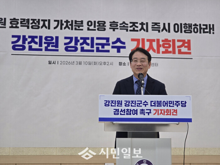 강 군수는 10일 강진읍 푸소센터에서 기자회견을 열고 서울남부지방법원이 징계결의 효력정지 가처분을 인용해 당원권이 회복됐음에도 경선 참여 기회가 주어지지 않고 있다고 밝혔다. 이는 사법부 판단 취지를 외면한 매우 이례적인 상황이라는 입장이다.