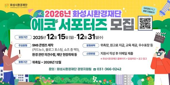 [화성=송윤근 기자] 경기 화성시환경재단이 오는 31일까지 환경 보호와 지속 가능한 미래를 위해 활동할 ‘2026 에코 서포터즈’를 모집한다.