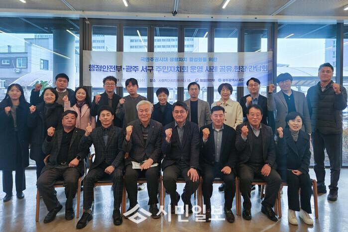 | ▲ 행정안전부 구본근 스마트복지안전공동체추진단장과 추진단, 광주시 서구를 방문해 마을 중심 자치행정 선도모델 사례 공유 현장 간담회 후 서구 관계자 등과 기념촬영 / 광주광역시 서구청 제공 |