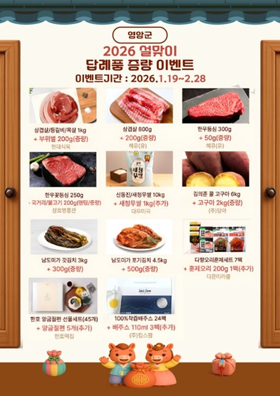 이영주 영암군 홍보전략실장은 “설을 맞아 고향사랑기부로 보내 준 정성에 푸짐한 답례품으로 보답하겠다. 많은 분들이 영암을 위해 기부하고, 영암의 따뜻한 정도 가져가길 바란다”고 말했다.
