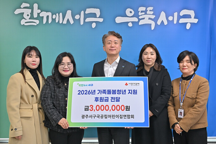 [광주=정찬남 기자] 김이강 광주광역시 서구청장(사진 가운데)이 27일 청장실에서 광주서구국공립어린이집연합회(회장 김경희)로부터 가족돌봄청년 지원을 위한 후원금 300만 원을 기탁 받은 후 관계자 등과 기념촬영을 하고 있다. / 광주 서구 제공