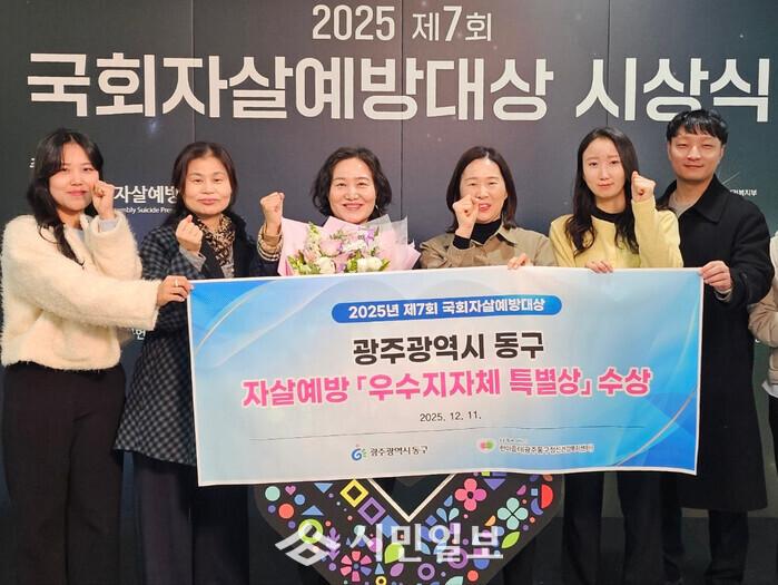 | ▲ 광주광역시 동구, 지난 11일 ‘제7회 국회 자살예방 대상’에서 우수 지방자치단체 특별상 수상 기념촬영 / 동구청 제공 |