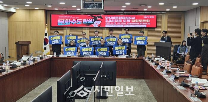 토론회에 참석한 국회의원과 토론자, 참석자들은 “민‧관‧정이 힘을 모아 2028년 계획 종료를 앞둔 아특법을 개정하고 국가 책임을 강화해 광주가 대한민국 문화분권의 상징도시이자 지속가능한 아시아문화중심도시 3.0시대로 도약할 수 있도록 함께 노력하자”고 뜻을 모으며 손팻말 퍼포먼스를 선보였다.