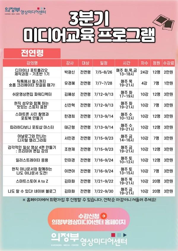 [시민일보 = 이승준 기자] 의정부영상미디어센터(센터장 박진식)가 오는 7월11일까지 지역내 주민을 대상으로 3분기 18개교육 프로그램 참가자를 추가모집한다.