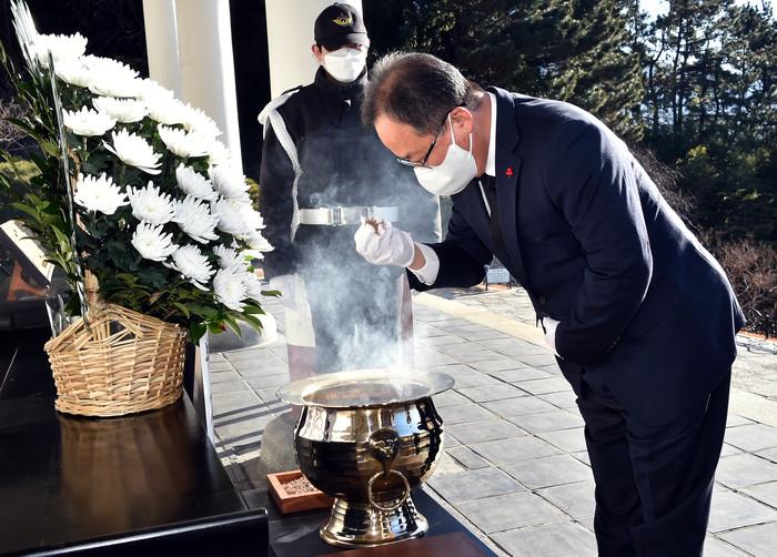 김석준 부산광역시교육감이 2022년 임인년 새해를 맞아 1월 1일 오전 10시 교육청 국장 4명과 함께 동래구 충렬사를 방문, 헌화와 분향을 하며 부산시민의 안녕과 부산교육의 발전을 기원하고 있다.