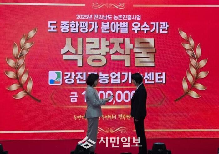 | ▲ 강진군 농업기술센터, 지난 11일 전라남도 주관 '2025년 농촌진흥사업 종합평가에서 ‘식량작물 기술보급 분야’ 우수기관 선정 시상 자료사진 / 강진군 제공 |