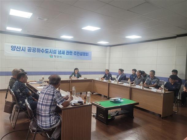[양산=최성일 기자] 양산시는 15일 수질정화공원 주변지역 주민들과 지역구 시의원이 참석한 가운데 하수처리장 냄새 저감을 위한 사업추진현황을 설명하고 주민들과 간담회 개최했다.