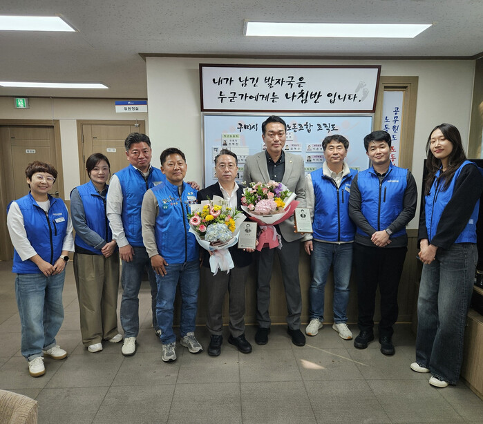 [구미=박병상 기자] 구미시의회 김근한 의원(국민의힘, 의회운영위원장)과 김민성 의원(국민의힘, 의회운영위 간사)은 24일 구미시공무원노동조합 사무실에서 공무원 권익 보호 입법 공로로 전국시군구공무원노동조합연맹으로부터 감사패를 받았다.