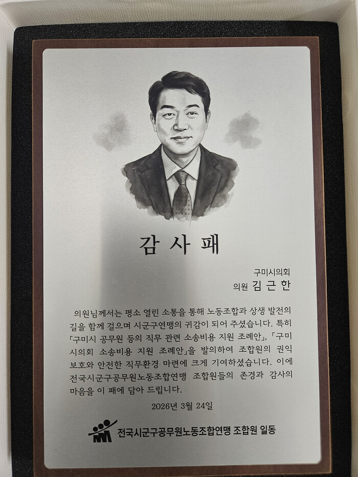 이번 감사패는 두 의원이 지난 1월과 3월 임시회에 각각 공동 발의한 「구미시의회 소송비용 지원 조례안」과 「구미시 공무원 등의 직무 관련 소송비용 지원 조례안」을 통해 공무원의 권익 보호와 안정적인 직무 수행 환경 조성에 기여한 공로를 인정받아 수여되었다.