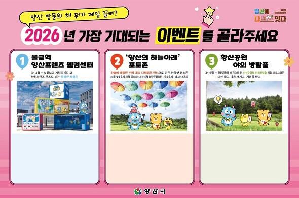 양산시 관계자는 “2026 양산방문의 해는 행정이 일방적으로 만드는 관광이 아니라, 시민과 함께 만들어가는 관광도시 프로젝트”라며 “이번 시민 참여 이벤트를 통해 시민들이 기대하는 관광 콘텐츠를 직접 확인하고, 이를 실제 사업으로 구체화해 나가겠다”고 밝혔다.