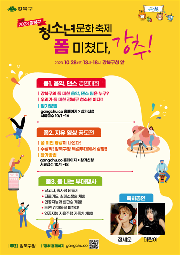 댄스/음악 경연대회 참가 대상은 ▲강북구 소재 초·중·고생 및 강북구 거주 19세 이하 청소년으로 10월 16일까지 홈페이지에서 온라인 신청 접수하면 되며, 10월 22일 강북구청 강당에서 13시부터 예선이 진행되며, 28일 본선이 치러지고, 수상자에게는 구청장상이 수여된다.