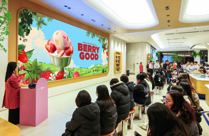 | ▲ 29일 ‘워크샵 by 배스킨라빈스’에서 열린 언텁쇼에서 참가자들이 1월 이달의 맛 ‘베리 굿’에 대한 설명을 듣고 있다. |