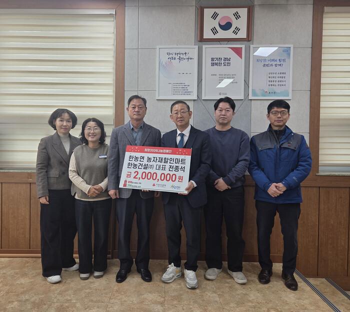 박수현 면장은 “매년 이웃을 생각하는 따뜻한 마음으로 나눔을 이어가는 한농연 농자재할인마트에 깊이 감사드리며, 전달받은 성금은 도움이 필요한 이웃들에게 소중히 전달하겠다”고 밝혔다.