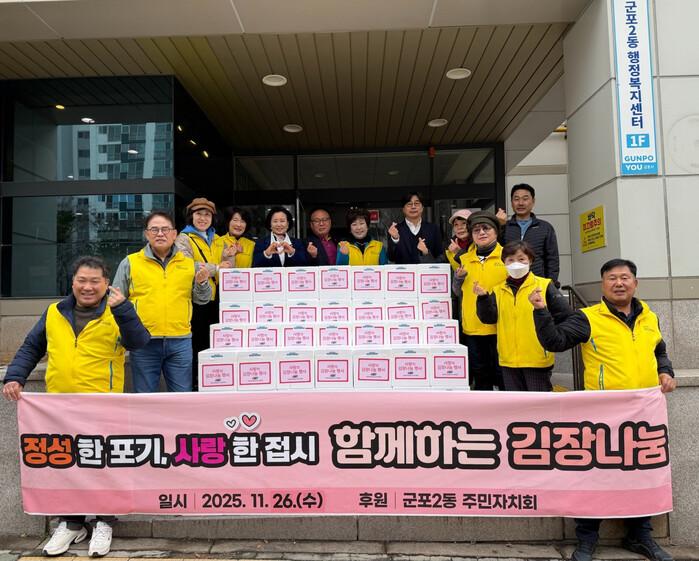 이번 나눔 활동은 군포2동 주민자치회 후원으로 저소득 취약계층 100가구에 김장김치(5kg)를 나눠주는 행사로 어려운 이웃들에게 김장 준비에 대한 부담을 덜어주고 작은 위로와 든든한 반찬 한 가지라도 보태고자 하는 마음을 담아 세심하게 준비됐다.
