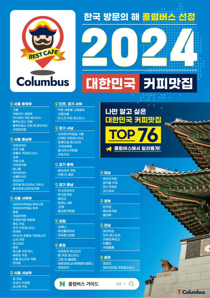 콜럼버스 가이드는 최고의 스페셜티 커피를 즐기고자 하는 관광객들을 위해 나라별로, 도시별로 최고 수준의 ‘커피 맛집’을 선정하는 프로그램이다.