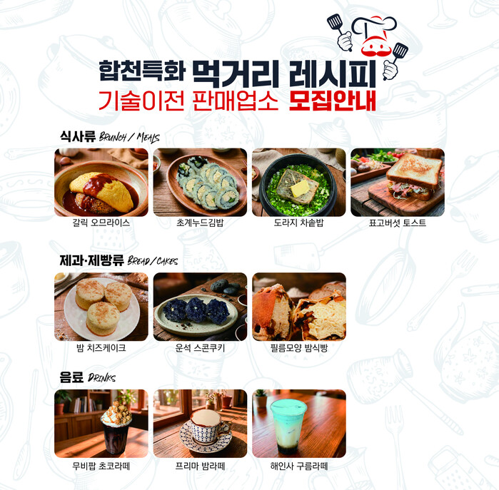 모집 대상은 합천군 내에 영업 신고가 된 일반음식점, 제과점, 휴게음식점 등이며, 기술이전을 통해 창업을 준비 중인 예비 창업자도 신청 가능하다.