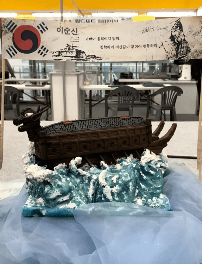 2025년 연말을 장식하는 국내 최대규모 월드푸드챔피언십 제과부문에서 최고상을 차지한 두학생의 작품에는 자못 의미 심장한 문구가 달려있다. 마지팬으로 정성스레 만든 그들의 케익에는 흔히 볼 수 없는 거북선이 자리잡고 있다.